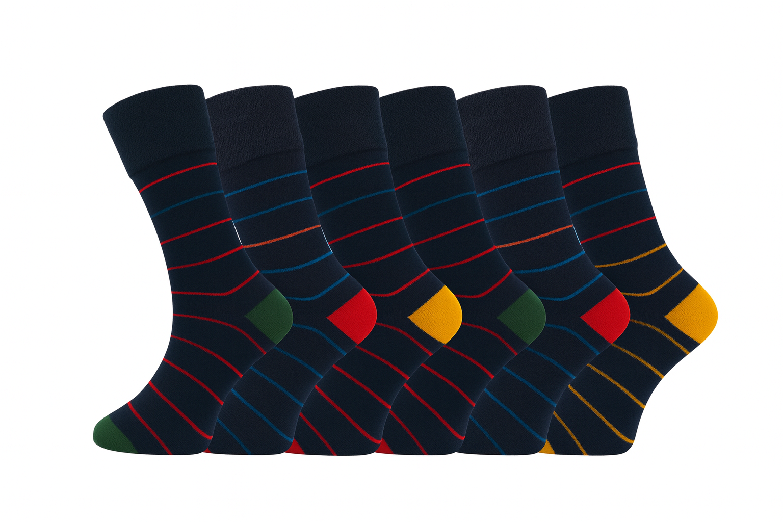 These diabetic men's socks offer a non-elastic cuff and smooth toe seam to prevent irritation and improve comfort. Made from a soft, rich cotton blend (84% cotton, 14% polyester, 2% elastane), they provide a loose fit with easy grip ideal for sensitive feet. Featuring a striped pattern and plain weave, they balance breathability and durability. Machine washable and sized to fit UK shoe sizes 6-11, these socks are designed to support foot health without restricting circulation. Made in Turkey.